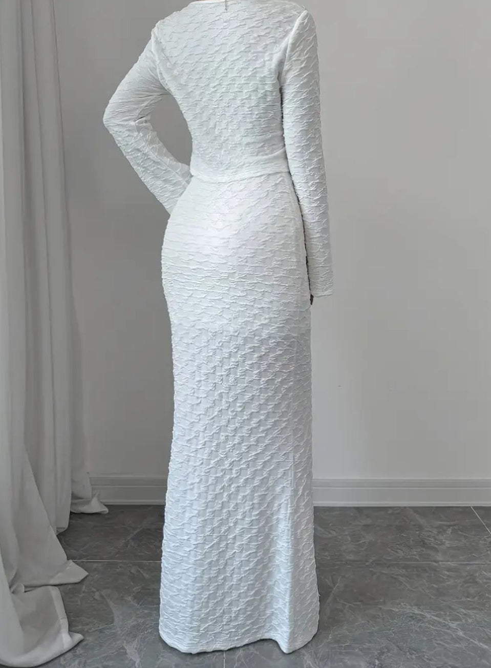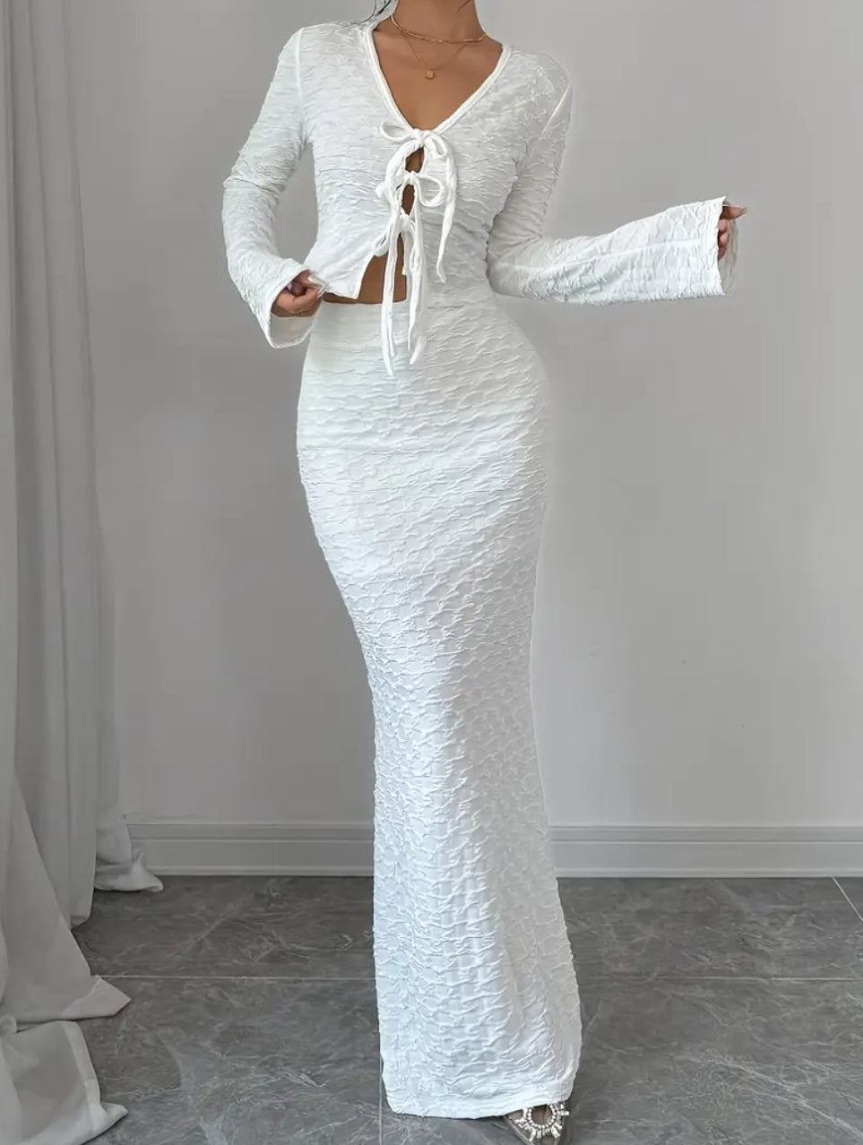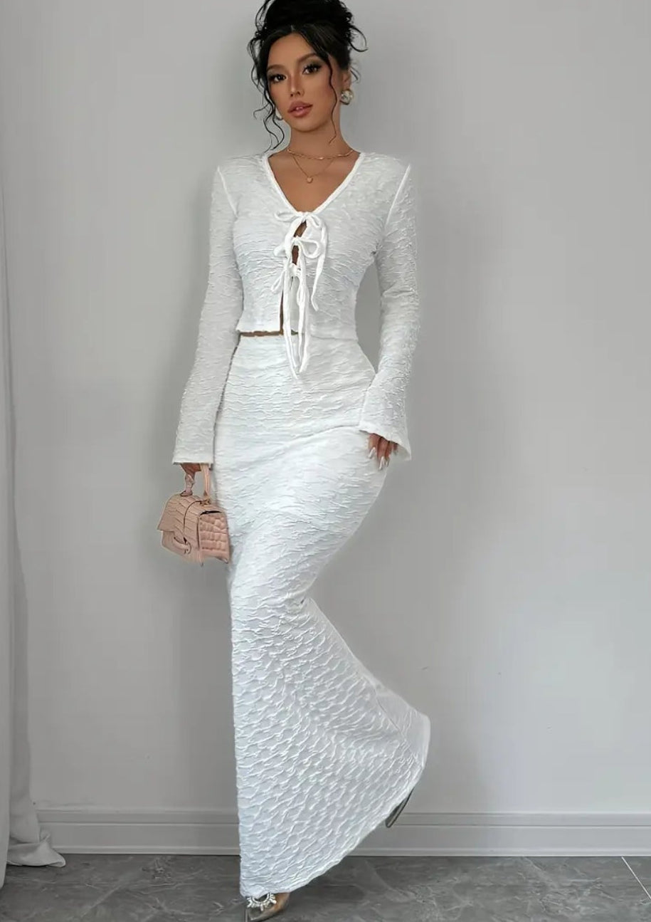 Women'S Elegant White V-Neck Long Sleeve Maxi Skirt Set - Polyester, Solid Color, Vacation Style, Fall/Winter Fashion, Drawstring Detail, Casual Attire|Vacation Style|Polyester Fabric